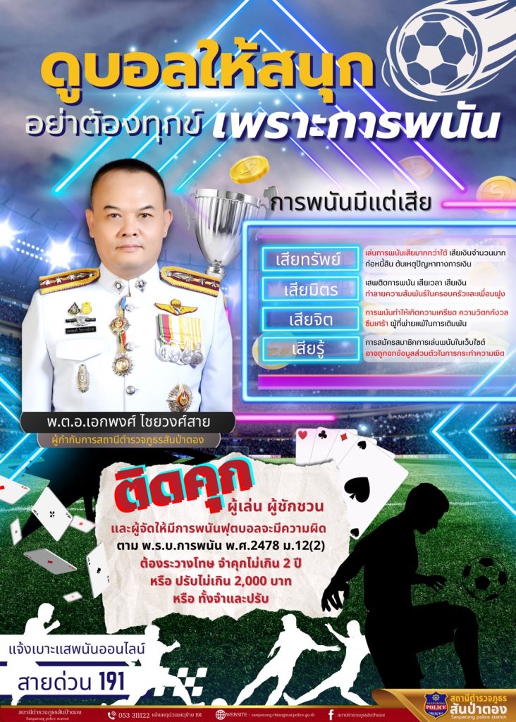 จึงขอให้พี่น้องประชาชน รับชมการแข่งขันฟุตบอลอย่างสร้างสรรค์ อย่าหลงผิดไปเล่นพนันฟุตบอล เพราะผลเสียที่จะตามมานั้นมีมากมาย