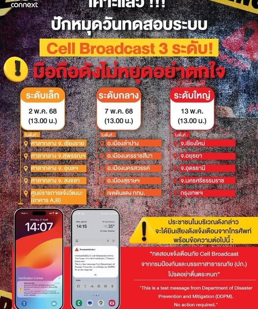 ปภ.เคาะวันทดสอบส่งข้อความแจ้งเตือนผ่าน Cell Broadcast 3 ระดับ ในวันที่ 2, 7 และ 13 พ.ค.68 ผู้ที่อยู่ในพื้นที่ตามแผนการทดสอบนี้ จะได้รับข้อความทดสอบการแจ้งเตือนไปยังโทรศัพท์มือถือทั้งรูปแบบเสียงเตือนและข้อความบนหน้าจอ